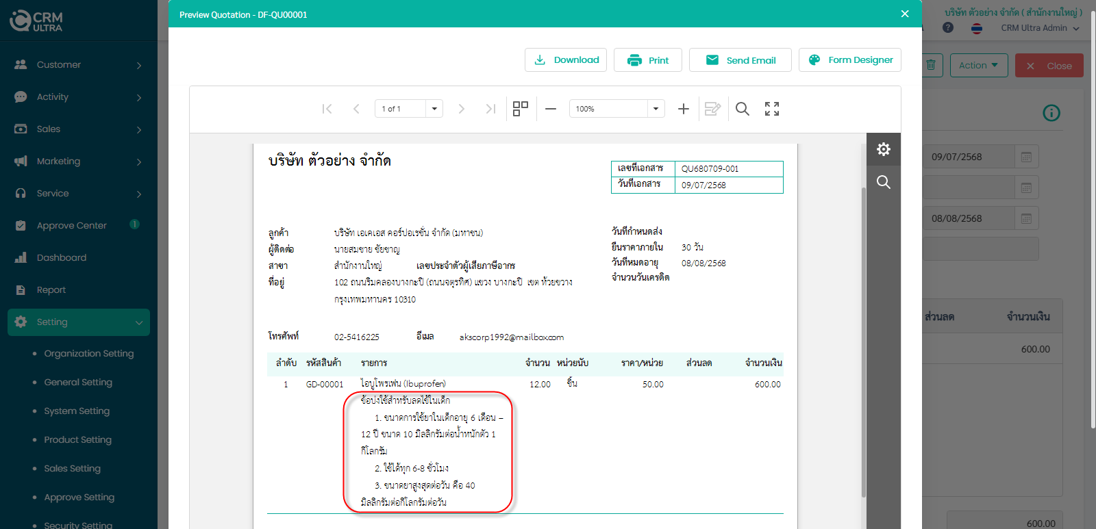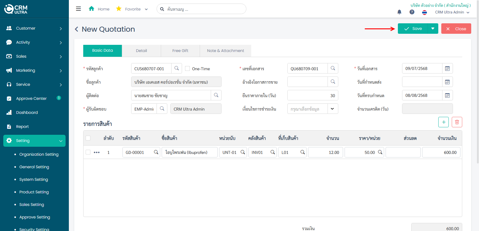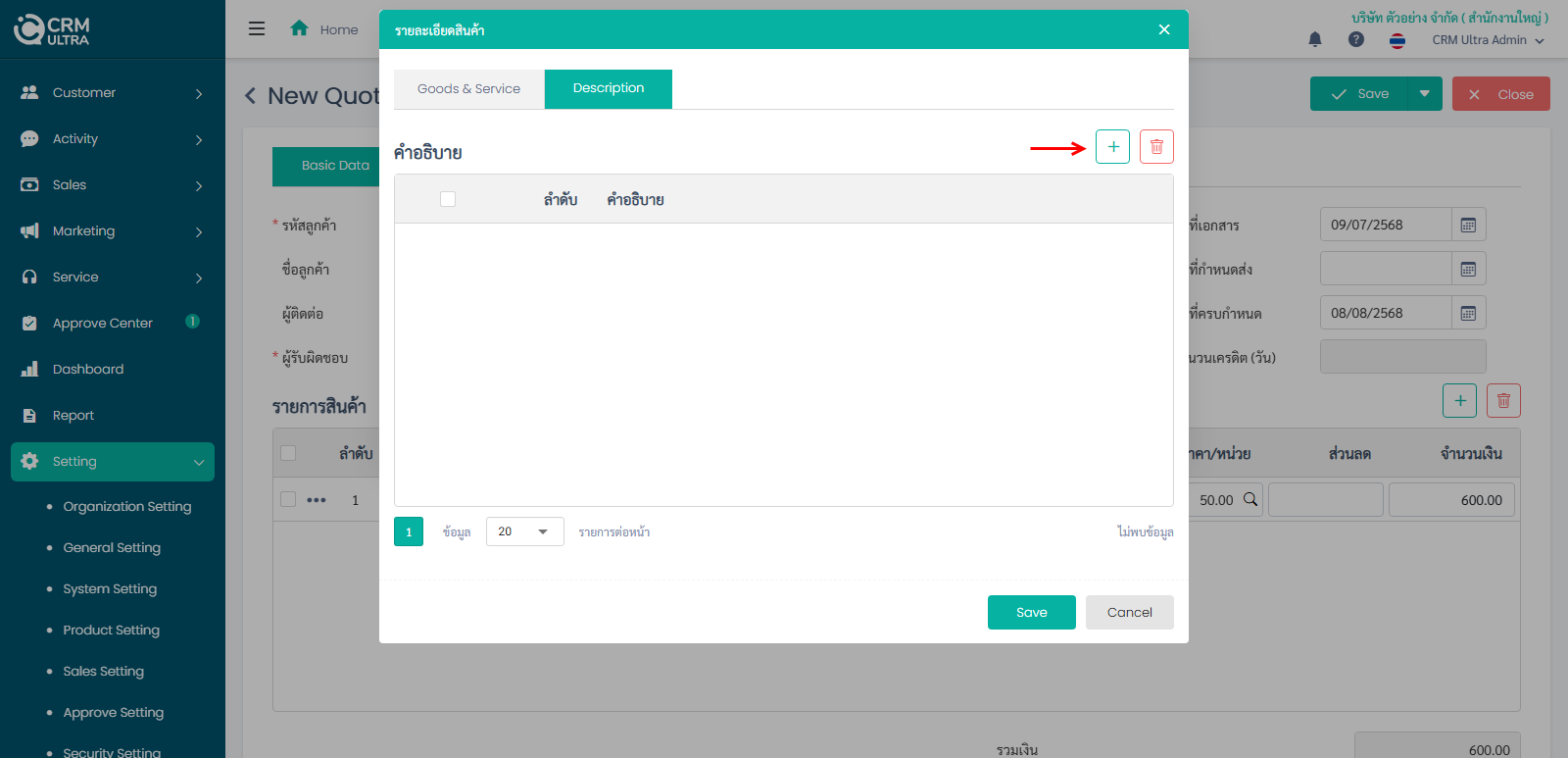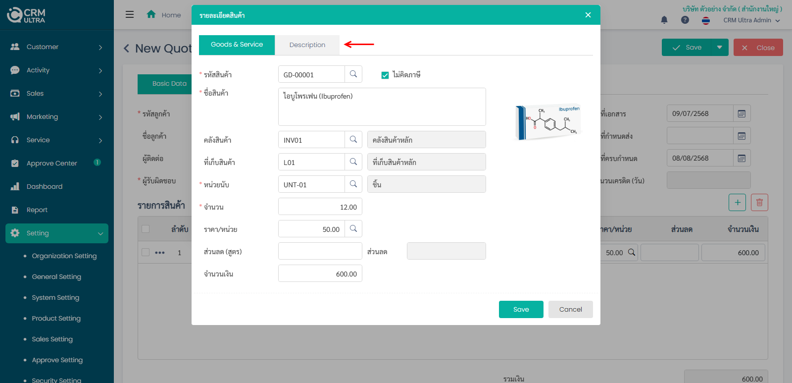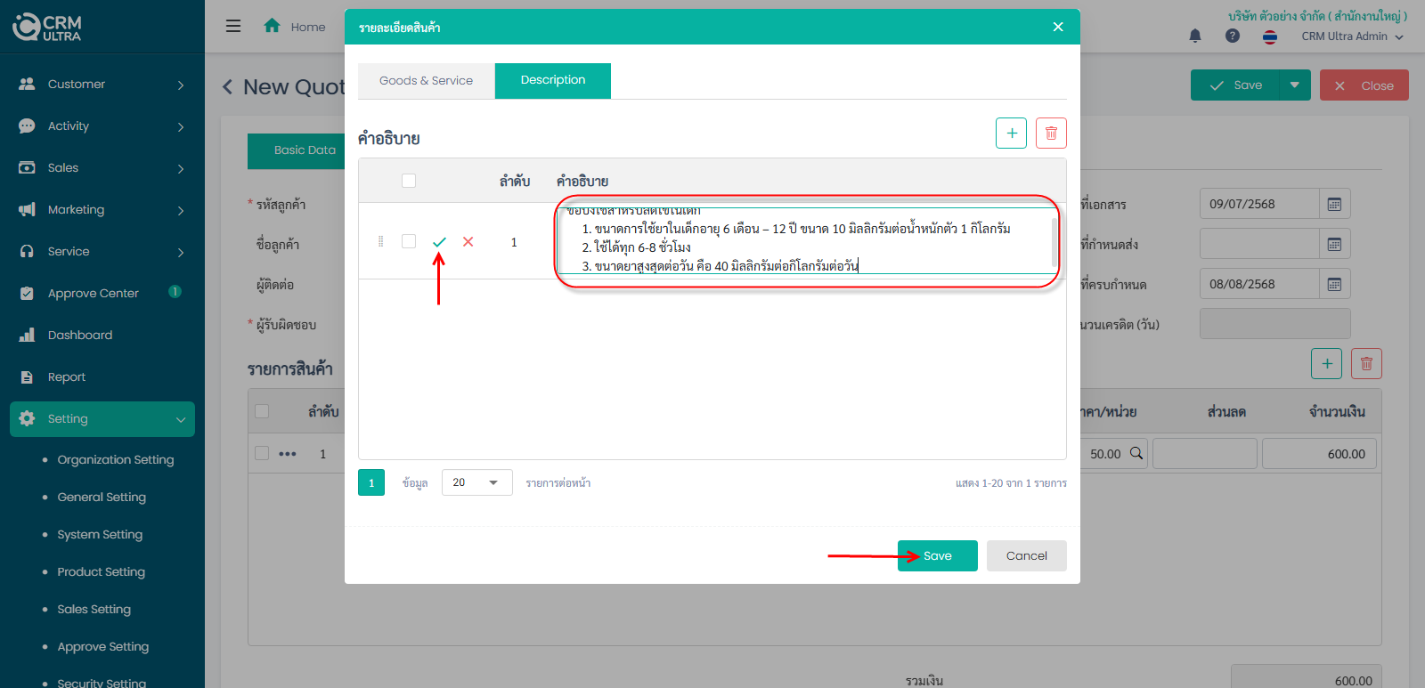 5. กรอกรายละเอียดสินค้าที่ต้องการในช่องคำอธิบาย โดยผู้ใช้สามารถพิมพ์ลงบรรทัดใหม่ได้ด้วยการกด Enter และผู้ใช้สามารถทำการกด Space Bar เพื่อขยับเว้นวรรคให้หัวข้อแต่ละหัวข้อมีการเยื้องกับหัวข้อด้านบนได้ ดังรูปภาพ จากนั้นกด "สัญลักษณ์ติ๊กถูก" และกด "Save"
