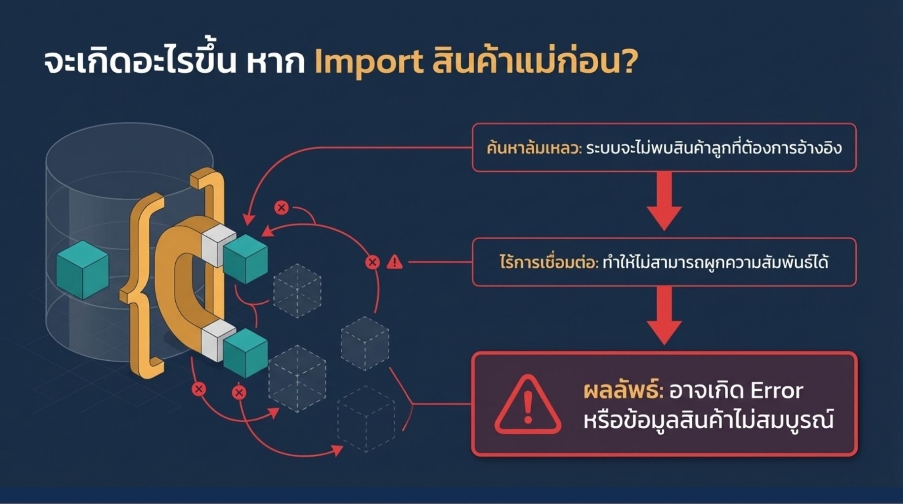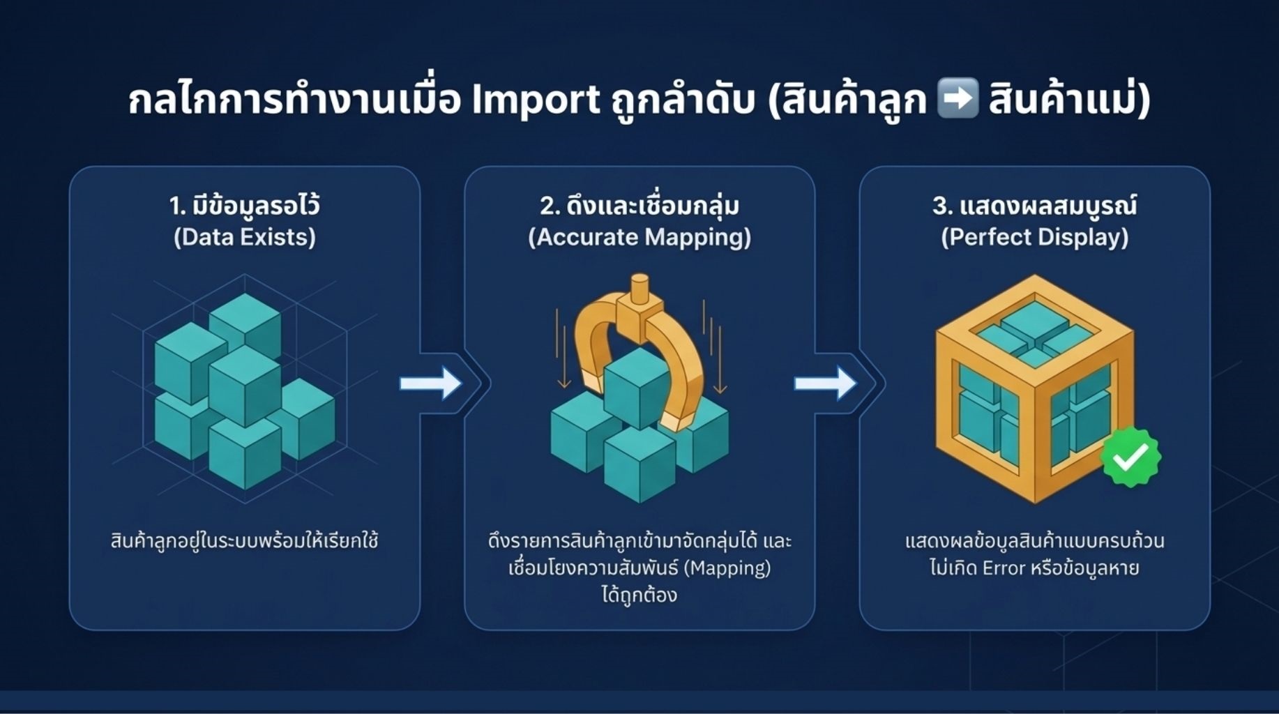 Q: ระบบทำงานอย่างไรเมื่อ Import ถูกลำดับ (สินค้าลูก → สินค้าแม่)?A: